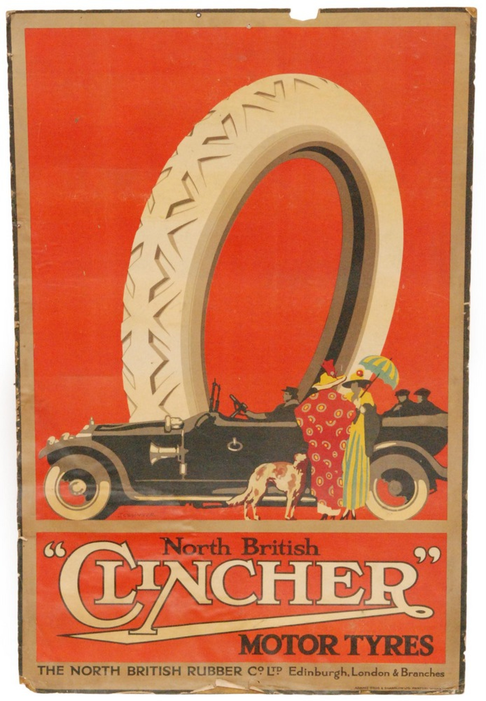 A 1920s pictorial cardboard advertising shop display sign for North British 'Clincher' Motor Tyres, the artwork by J. Grainger - SOLD £850