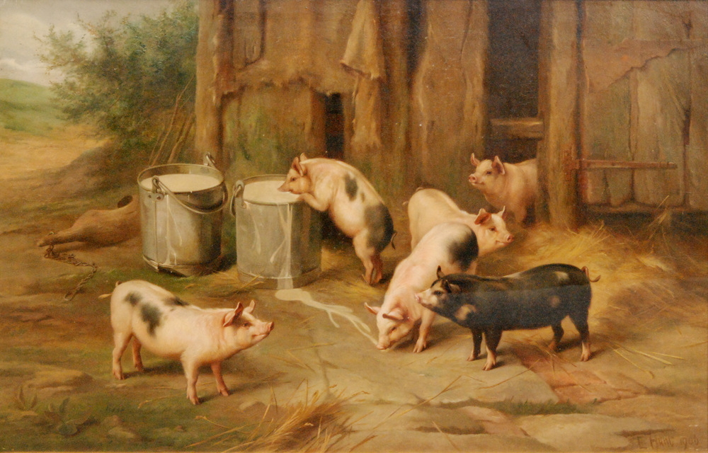 EDGAR HUNT (1876-1953) - Piglet's feeding time, oil on canvas, sold £8,000