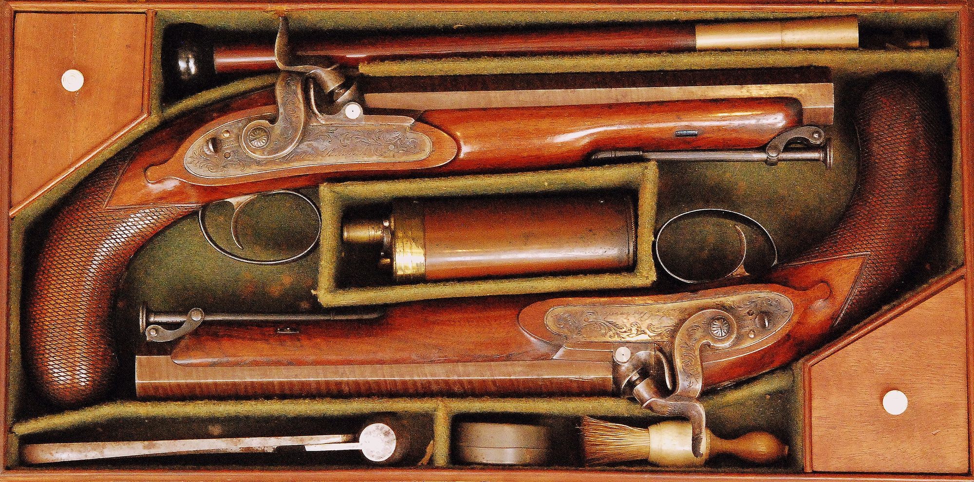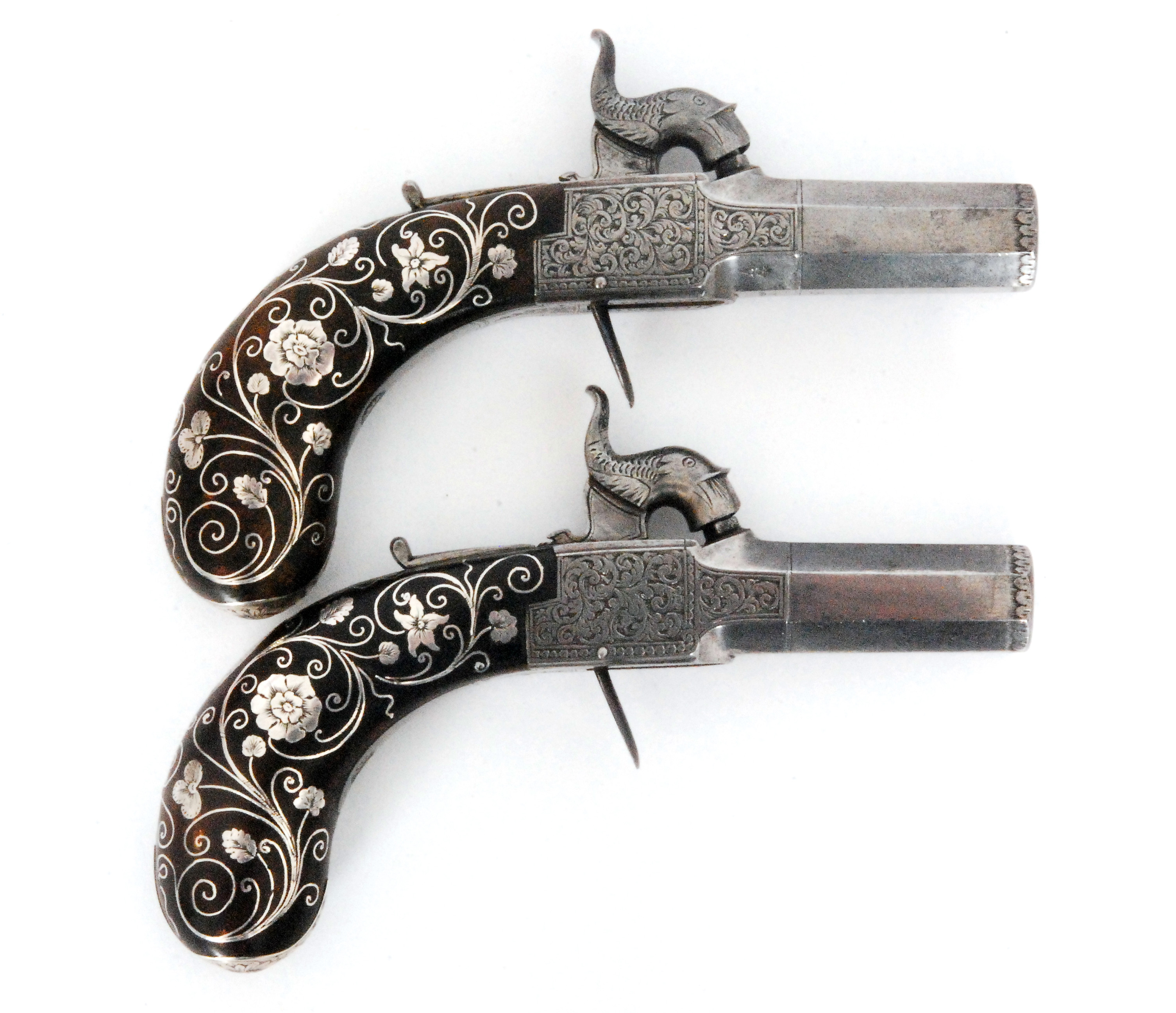 A pair of 19th Century percussion cap pocket pistols by J Lang Haymarket London, sold £3,100