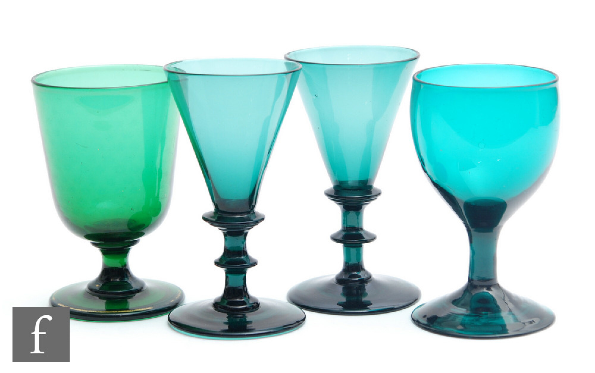 A pair of early 19th Century green wine glasses circa 1815, the drawn funnel bowls on an angular merese with stem with centre bladed knop and basal half knop, raised to a circular spread foot, with another green drinking glass circa 1760, the drawn ovoid bowl on a plain stem and conical foot, and another with bucket bowl with short plain stem and circular spread foot. (4)