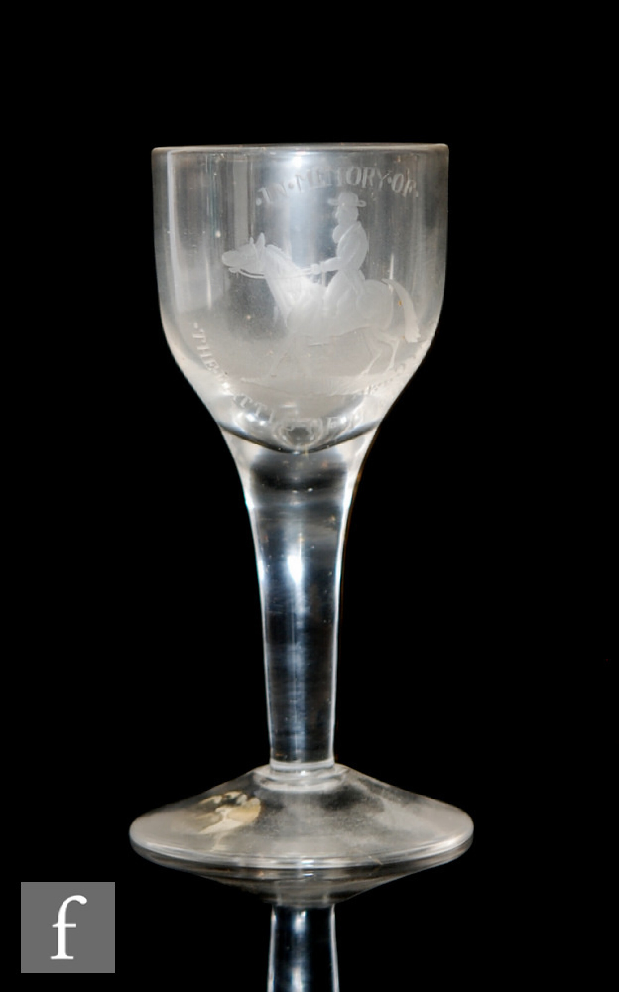 An 18th Century drinking glass circa 1750, the ogee form bowl engraved with a figure on horse back and 'In memory of the Battle of The Boyne' above plain stem and conical foot, bears Churchill label to the foot, height 14.5cm.