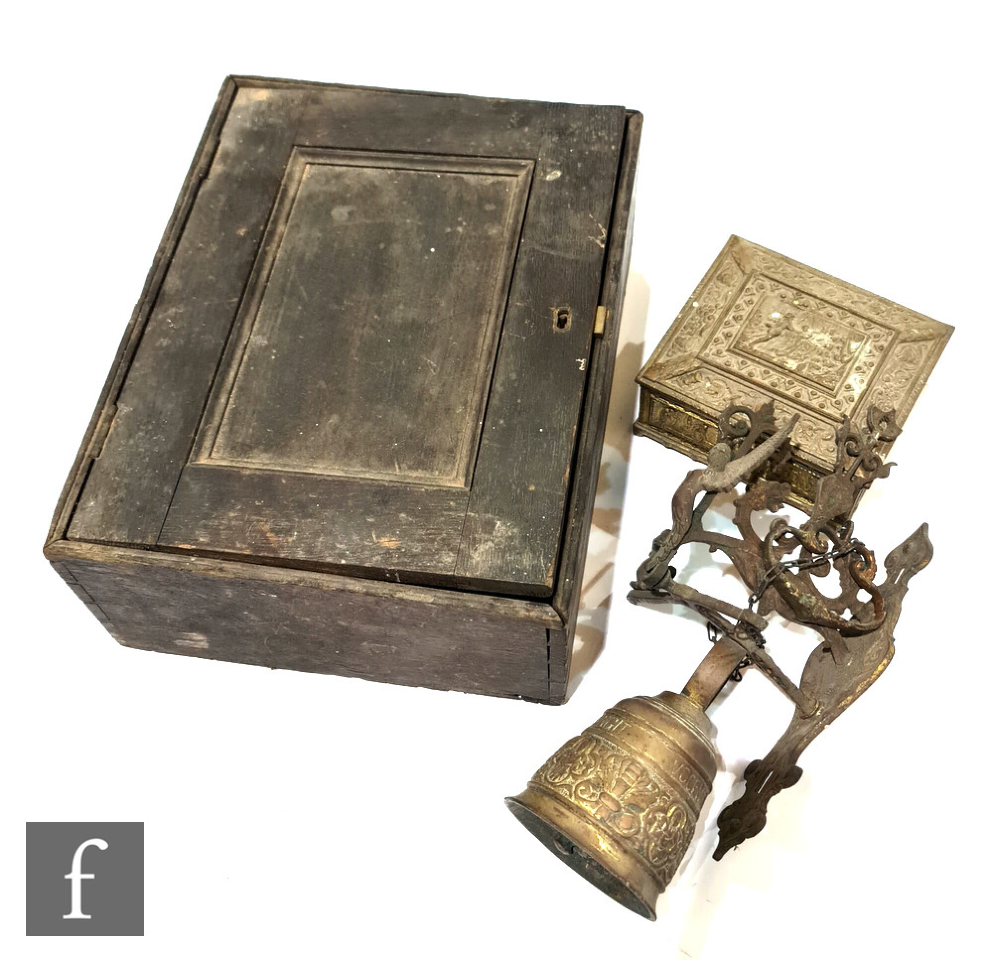 An early 19th Century ebonised wall cabinet with fitted interior enclosed by a panel door, 40cm x 30cm, a 20th Century brass casket in the Renaissance style and Tibetan style brass wall mounted bell, height 37cm. (3)