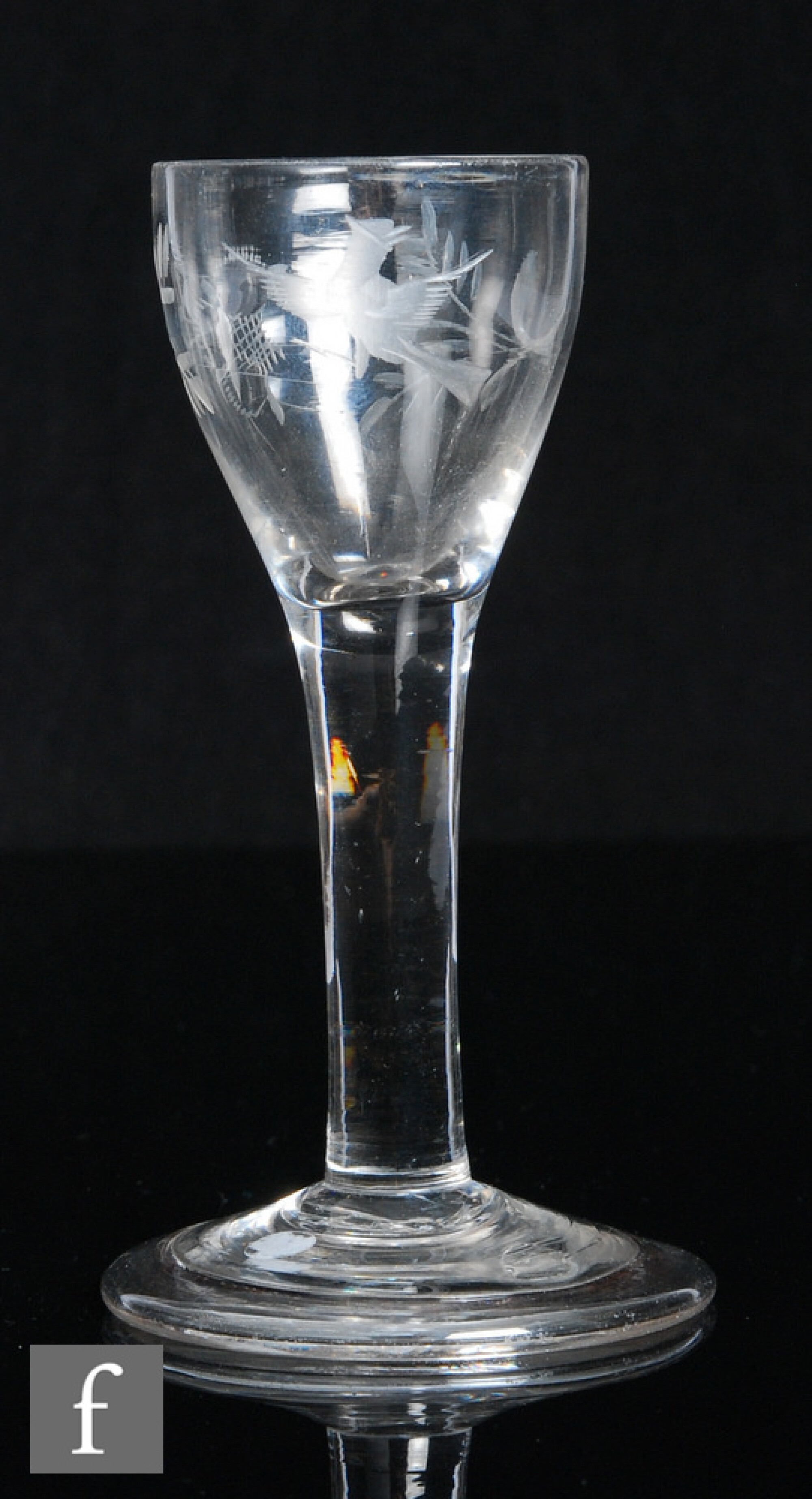 An 18th Century drinking glass, circa 1740, the pointed round funnel bowl engraved with a bird in flight with a stylised flower and leaves verso, above a plain straight stem and raised to a domed and folded foot, height 12.5cm.