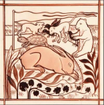 I had tried and failed before the sale to identify the designer of four Minton, Hollins & Co dust pressed tiles each hand enamelled in sepia and black over white glazed ground with scenes from Aesop's fables. They were estimated at £120- 150 but sold at £800.The reason? They were among a small number of designs done for Minton Hollins by Clement Heaton who is best known for his Arts and Crafts work in stained glass and enamelling.