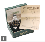 A stainless steel Rolex Oyster Perpetual meters first Submariner, 1967, with tropical batons to a black dial with Mercedes hour hand, case numbered 1410808, bracelet numbered 6636, with original receipt for £65.00 and guarantee both dated March 4th 1967, boxed.