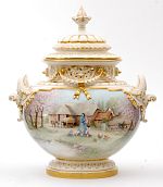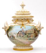 One of the expected top lots was a large Royal Worcester Pomander and cover estimated at £2000 to £3000. The piece was a contemporary piece but decorated very much in the traditional Royal Worcester taste by M. Powell with a country lane with cottages and a lady tending to geese, two gentlemen in conversation beside their horse and to the other side, a mother stood with her young family before farmyard building, signed, gilt mark, height 37cm. The piece attracted a great deal of interest and eventually sold to a buyer in Australia for a hammer price of £2400. The piece will be making its long journey very soon to its new home down under.
