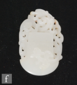 This piece was quickly followed by a Qing Dynasty (1644-1911), the pale green/white stone, with slight russet inclusions, of rounded pebble form, carved in low relief, the lower section carved in archaic form sword fitting, extending to an openwork scrolling dragon design surmounting the top section, 7cm x 4.5cm.