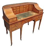 No 2 - An Edwardian mahogany and satinwood cross-banded Carlton House desk by Maple & Co Limited, the swept brass gallery above a drawers and fitted cupboard compartments over a leather inset slide above a long frieze drawer flanked by four small drawers on square tapering legs terminating in spade feet, stamped, height 104cm x depth 66cm x width 136cm