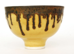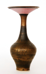 As well as making a small range of elegant and refined domestic pots such as teacups and saucers, plates and coffee-pots Rie produced individual vases and bowls. These were decorated either in rich, deep colours such as greens and yellows, many with a metallic bronze and gold rim, or were covered with dry, pitted glazes with dramatic but carefully controlled volcanic textures. All were thrown on the wheel and turned so that no throwing lines were left to disrupt the crisp profile and smooth surfaces. As a potter working in the centre of a large city, Rie had limited space, her output was small and she produced in limited quantity. As such the prices of her pots tended to be high in comparison with those of her contemporaries, a fact to which she was always acutely aware!