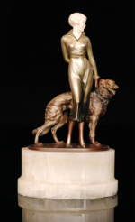 By the 1930’s Lorenzl was one of the principle designers at Goldscheider, although there were many freelancers employed by the firm and although he had used the naked female form in much of his bronze and ivory works it was during this period that he started to produce these mildly erotic yet beautiful nude figurines for Goldscheider. Nude with a Borzoi is a perfect example of Lorenzl’s talent for taking the naked female form and making it glamorous yet sophisticated.