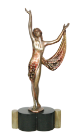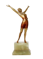 Lorenzl was born in Austria in 1892 and was soon to become one of the most talented sculptors of the Art Deco period working for a bronze foundry in Vienna where he produced a huge range of stunning bronze figures. The majority of his works in bronze and ivory were of singular slim female nudes with slender limbs in dancing poses, almost as if frozen in a moment of expressive freedom. Like his contemporaries Lorenzl work was created using Chryselephantine, a Greek word which refers to the combination of various materials such as bronze, ivory, gold and silver. He signed his pieces in various ways sometimes abbreviating his name to Lor or Enzl but on some of the statuettes you will find an additional signature by Crejo. A talented painter who worked alongside Lorenzl, Crejo would paint decoration onto the statuettes such as flowers and abstract designs to the folds of the dancing girls dresses.